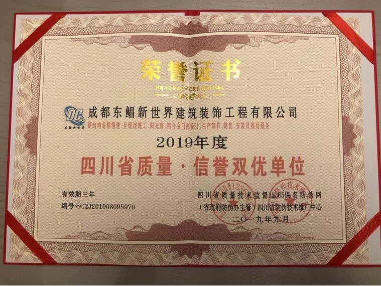 成都東鯧新世界裝飾工程有限公司榮獲2019年度四川省質量、信譽雙優單位